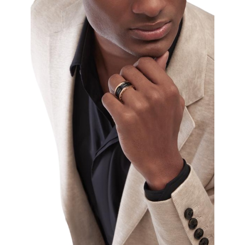 Inspired by the world-famous amphitheater, the Colosseum, the B.zero1 ring is a true expression of Bvlgari’s creative vision, challenging the very essence of jewellery design. Its unique, pure spiral shape symbolises the harmony of past, present and future – reflected in the magnificence of the Eternal City – and the pioneering spirit of the collection. B.zero1 four-band ring in 18K rose gold, adorned with black ceramic.
