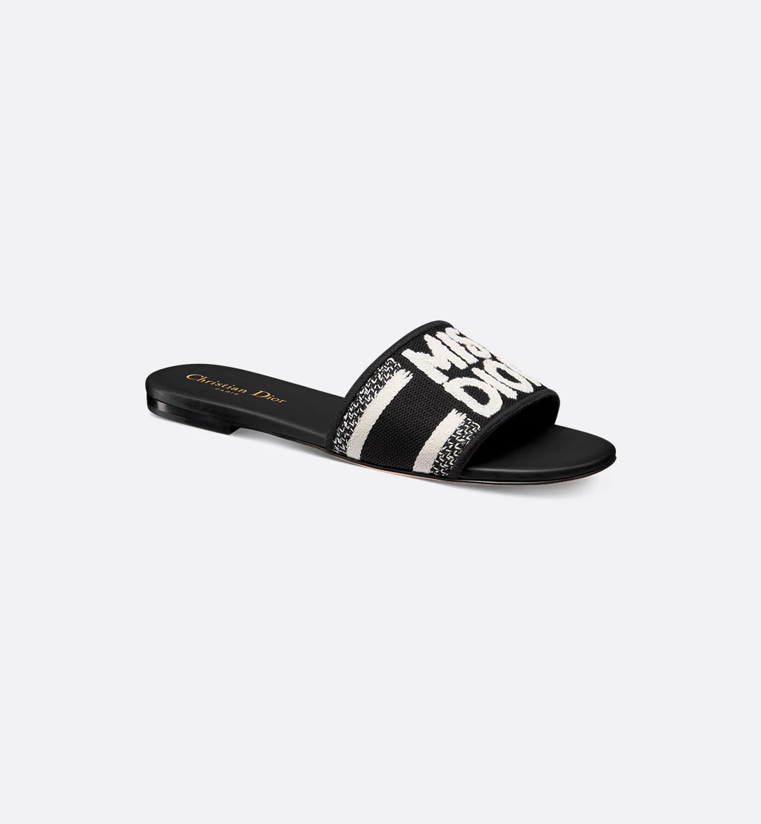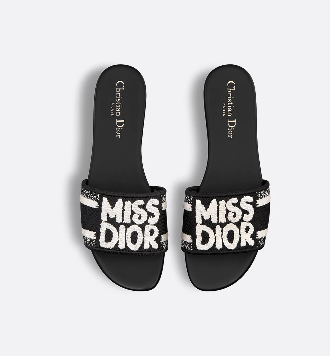 The Dway slide features a black upper embroidered with the white Miss Dior Graffiti signature, a nod to the 1967 debut ready-to-wear collection and a manifesto to Maria Grazia Chiuri’s signature celebration of feminism. The sleek design slips on easily for a laid-back style. The shoe can be paired with other Miss Dior Graffiti creations.