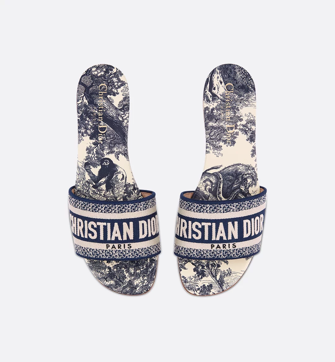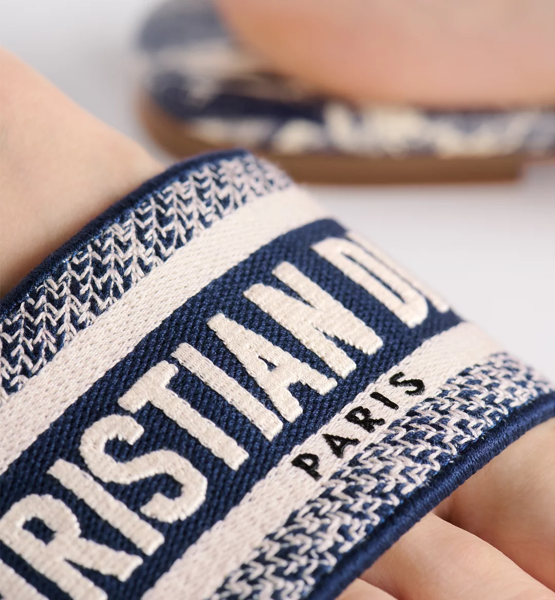 The Dway slide is a hallmark and timeless style honoring the House’s Toile de Jouy motif. The vibrant blue upper has an embroidered Christian Dior Paris signature for an instantly recognizable touch. Its streamlined silhouette makes it easy to slip on to complete a relaxed look. The shoe will pair well with other Toile de Jouy creations from the collection.