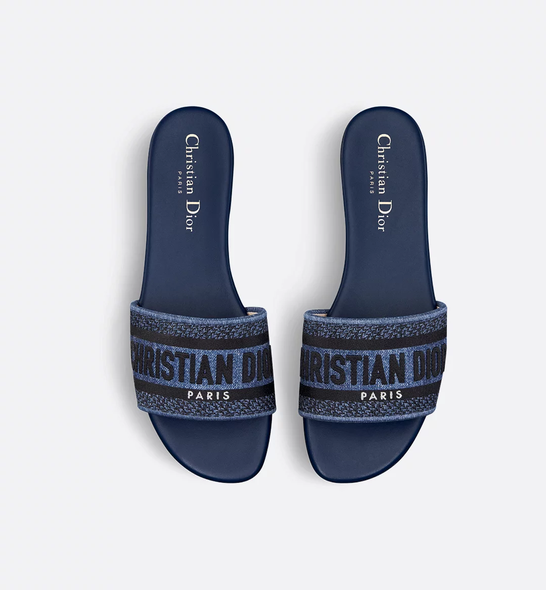 The Dway slide has a timeless and emblematic silhouette. The blue cotton denim upper is embroidered with the instantly recognizable Christian Dior Paris signature. The streamlined slide slips on easily, offering effortless style.