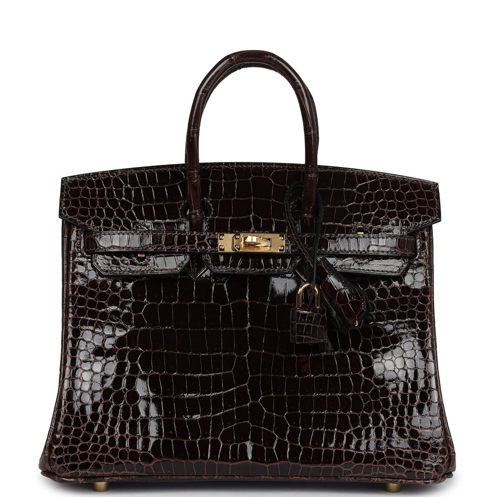 This Birkin is in Macassar shiny porosus crocodile with gold hardware and has tonal stitching, front flap, two straps with center toggle closure, clochette with lock and two keys, and double rolled handles.