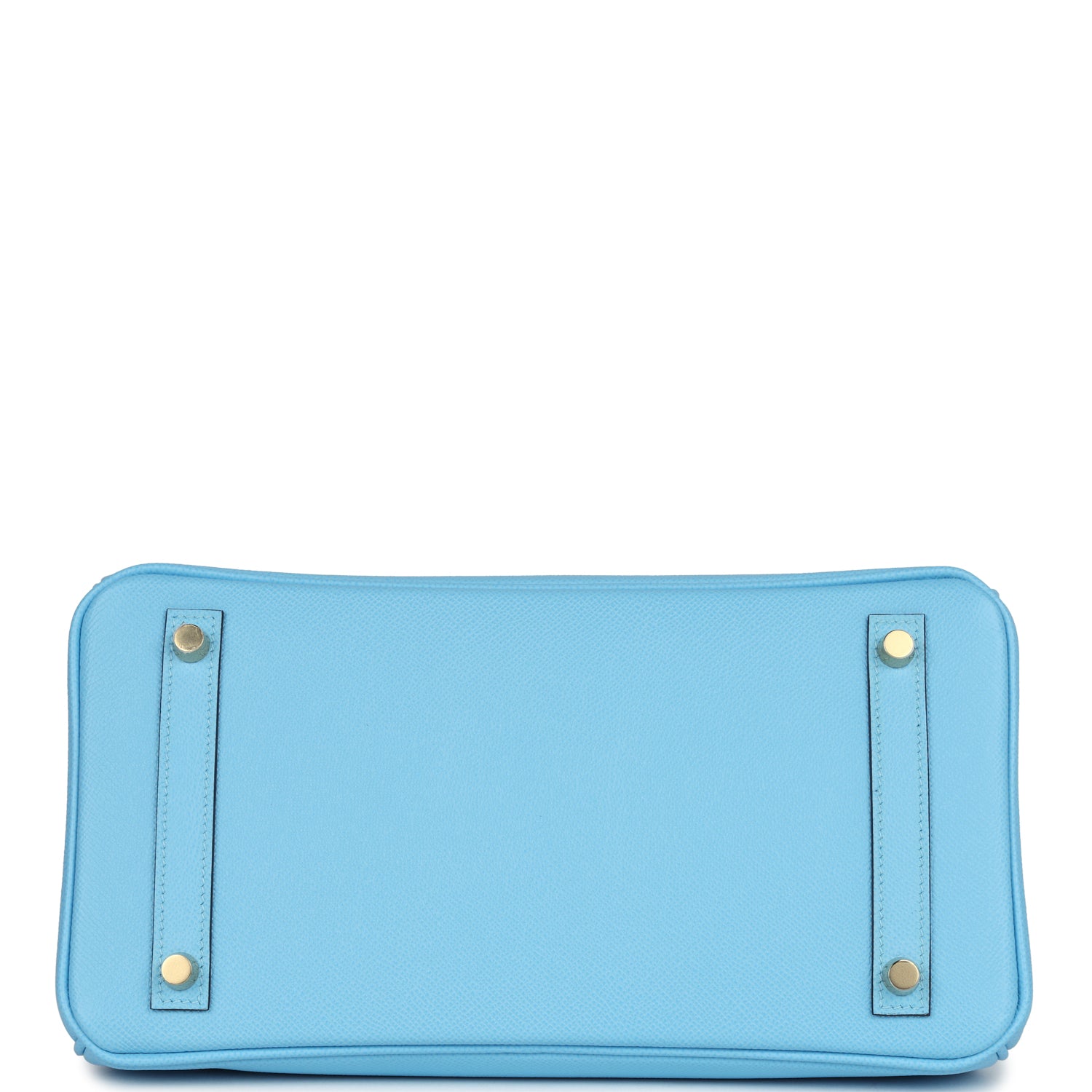 This Birkin is in Celeste epsom leather with gold hardware and has tonal stitching, front flap, two straps with center toggle closure, clochette with lock and two keys, and double rolled handles.