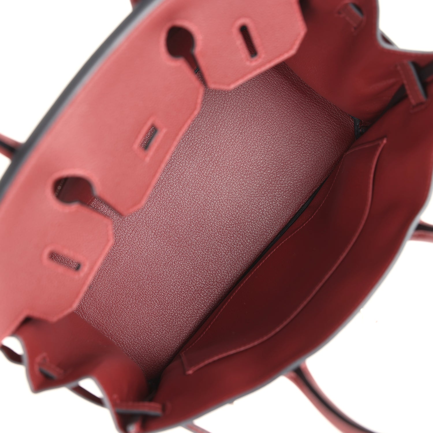 The interior is lined with Rouge H chevre and has one zip pocket with an Hermès engraved zipper pull and an open pocket on the opposite side.