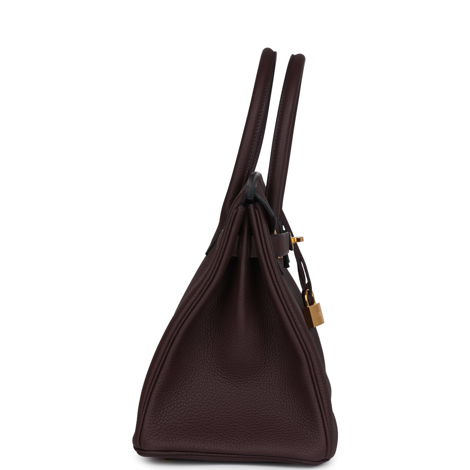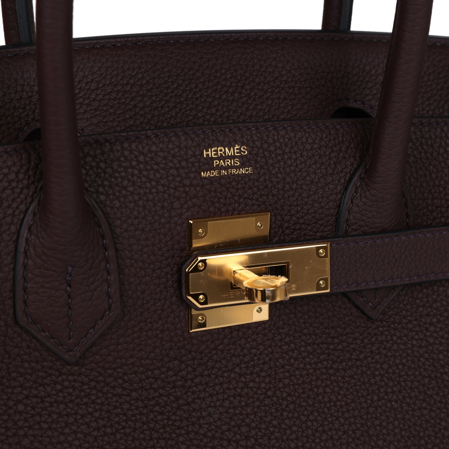 This Birkin is in Rouge Sellier togo leather with gold hardware and has tonal stitching, front flap, two straps with center toggle closure, clochette with lock and two keys, and double rolled handles.