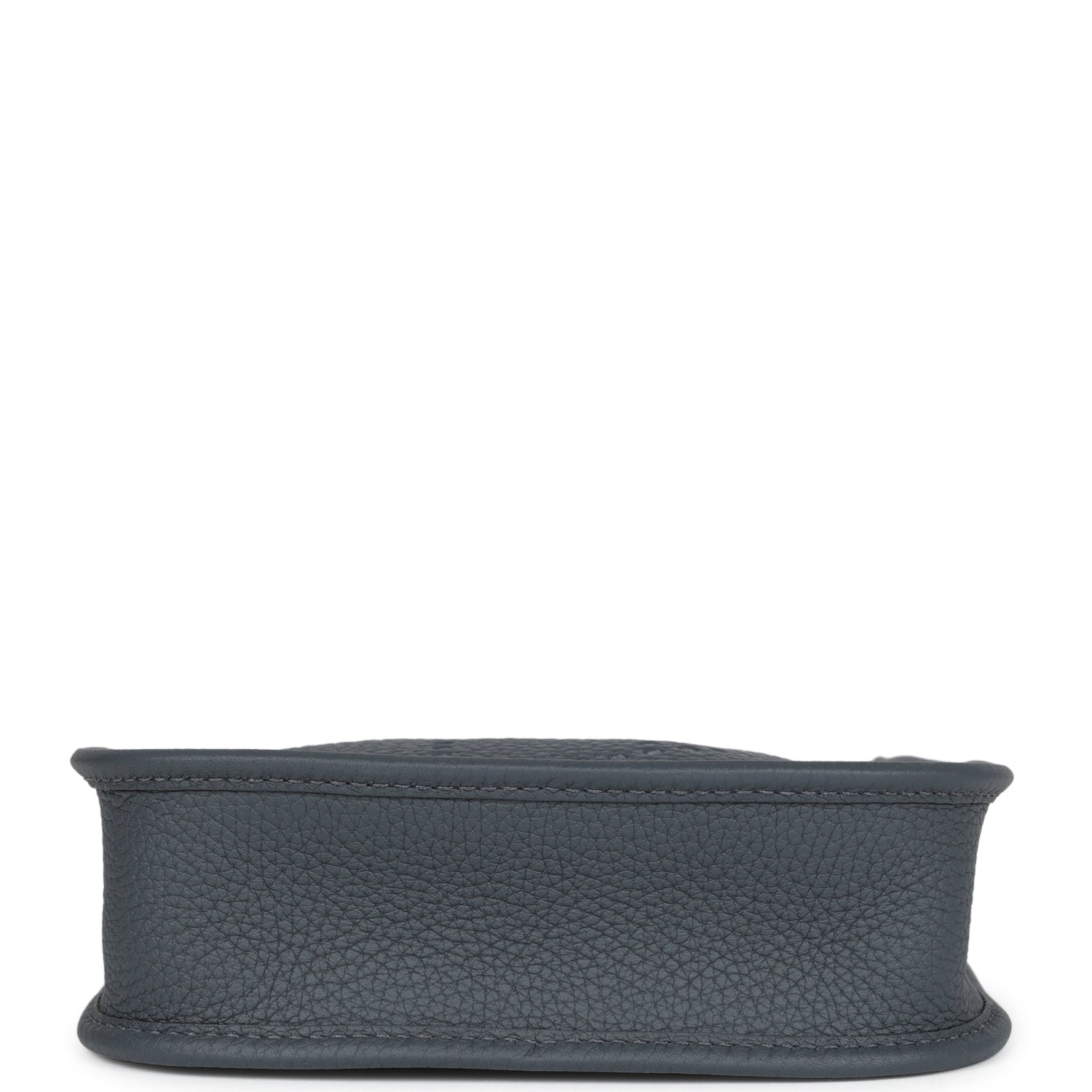 This Evelyne TPM is in Gris Misty clemence leather with permabrass hardware, leather messenger bag with tonal stitching, large perforated H in circle (front), pull tab snap closure, and a removable shoulder/crossbody strap.