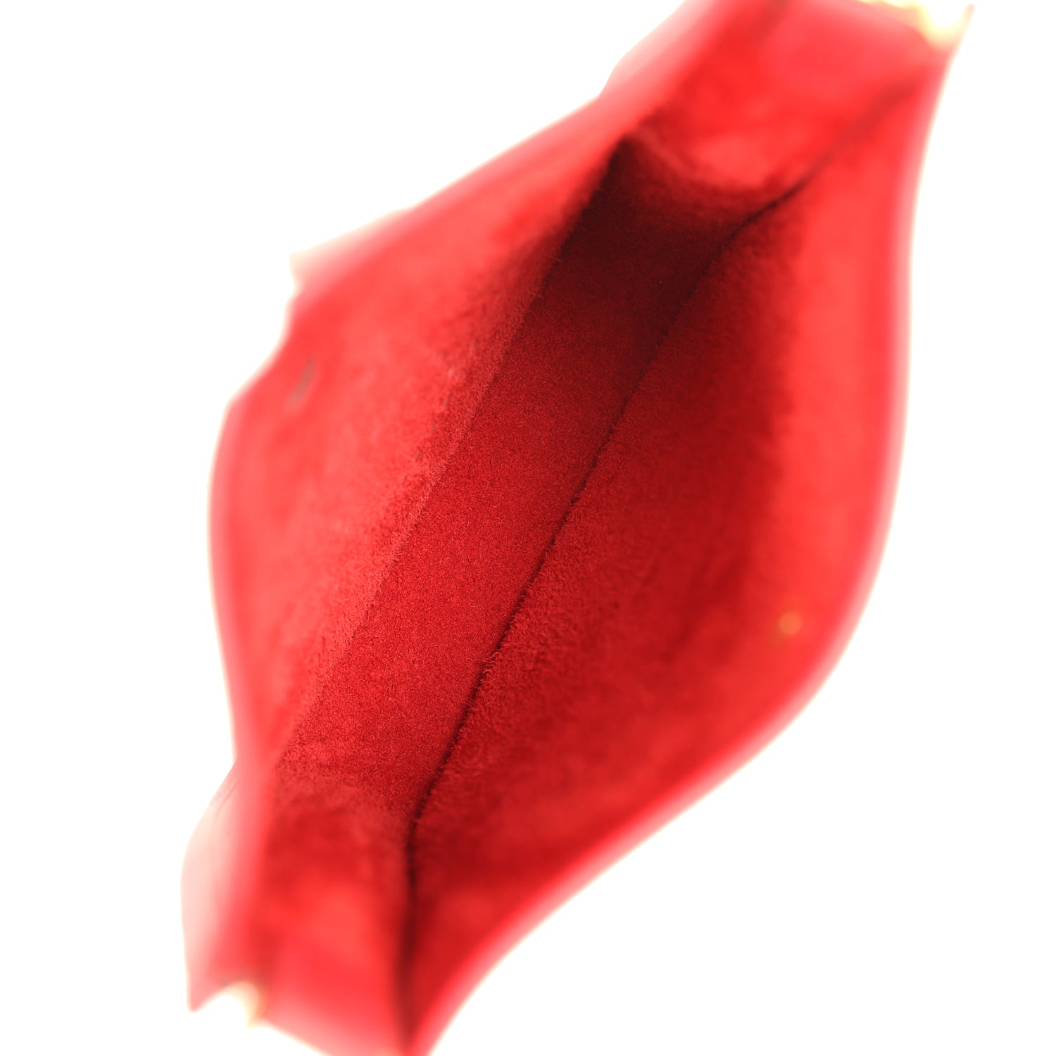 This Evelyne TPM is in Vermillion clemence leather with gold hardware and features tonal stitching, pull tab top closure and a matching removable canvas and leather shoulder/crossbody strap.