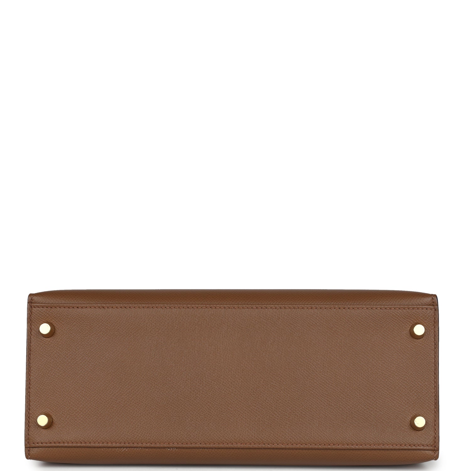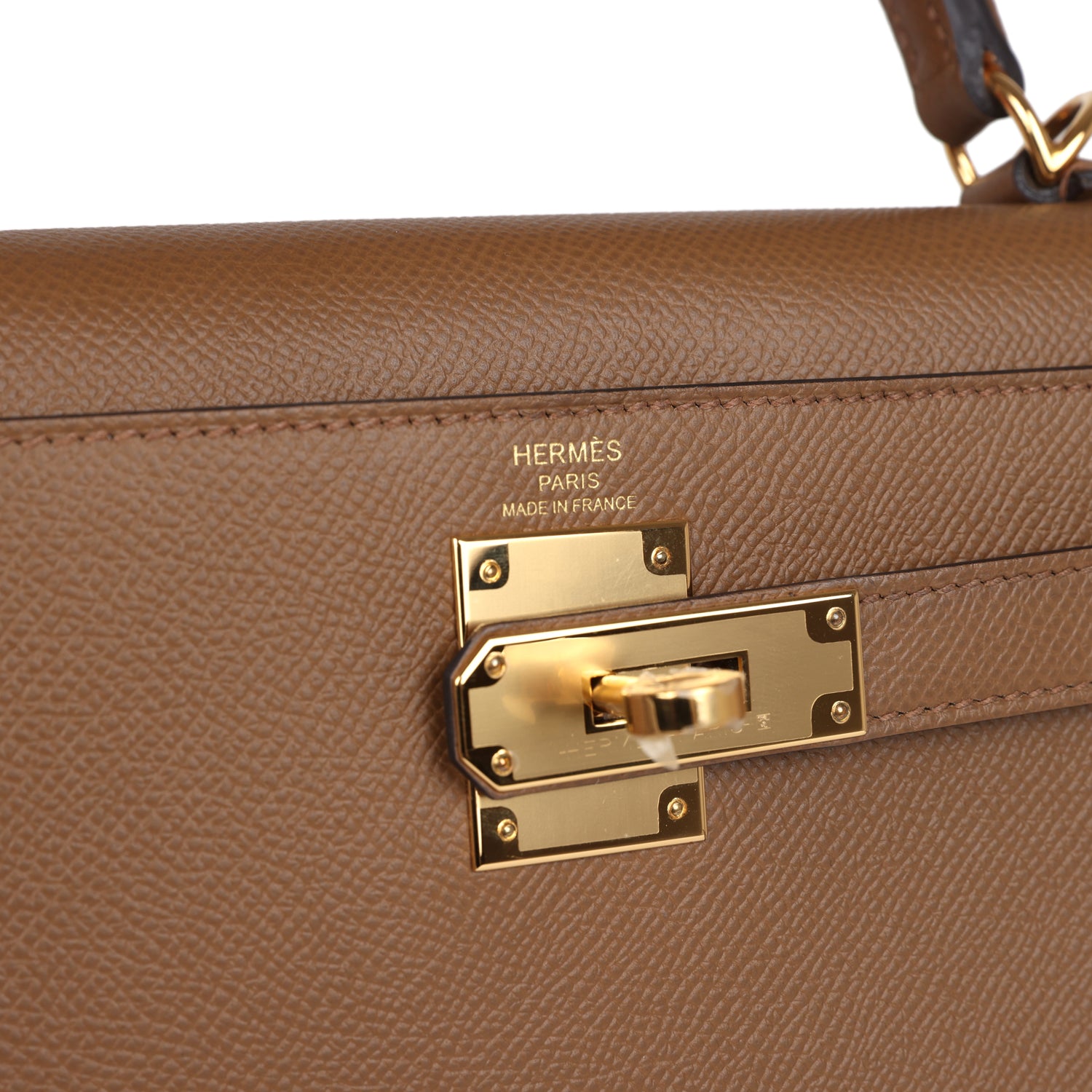 This Kelly, in the Sellier style, is in Alezan epsom leather with gold hardware and has tonal stitching, front flap, two straps with center toggle closure, clochette with lock and two keys a single rolled handle and removable shoulder strap.