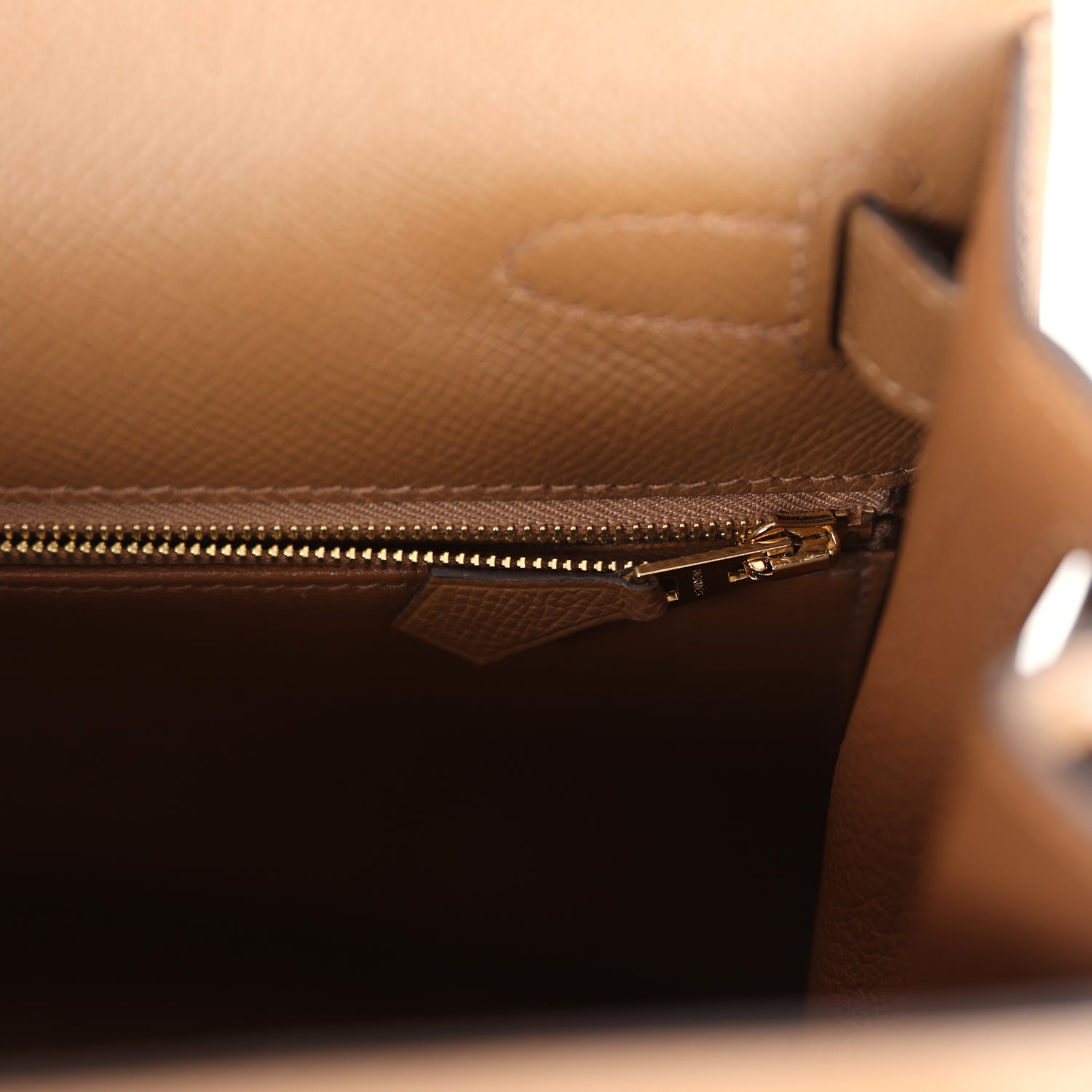 The interior is lined with Alezan chevre leather and has one zip pocket with an Hermès engraved pull and two open pockets on the opposite side.