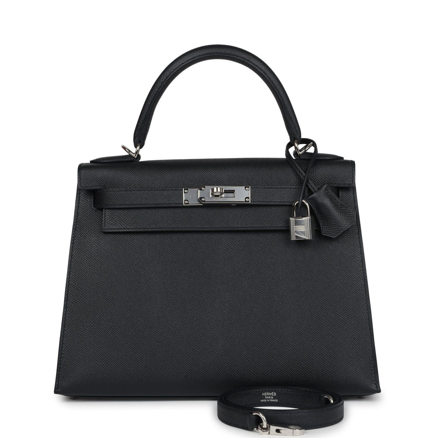 This Kelly Sellier is of Black epsom leather with palladium hardware and has tonal stitching, a front toggle closure, a clochette with lock and two keys, a single rolled handle and an optional shoulder strap.