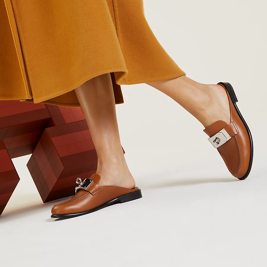 Mule in Heritage calfskin with iconic palladium-plated oversized Kelly buckle.