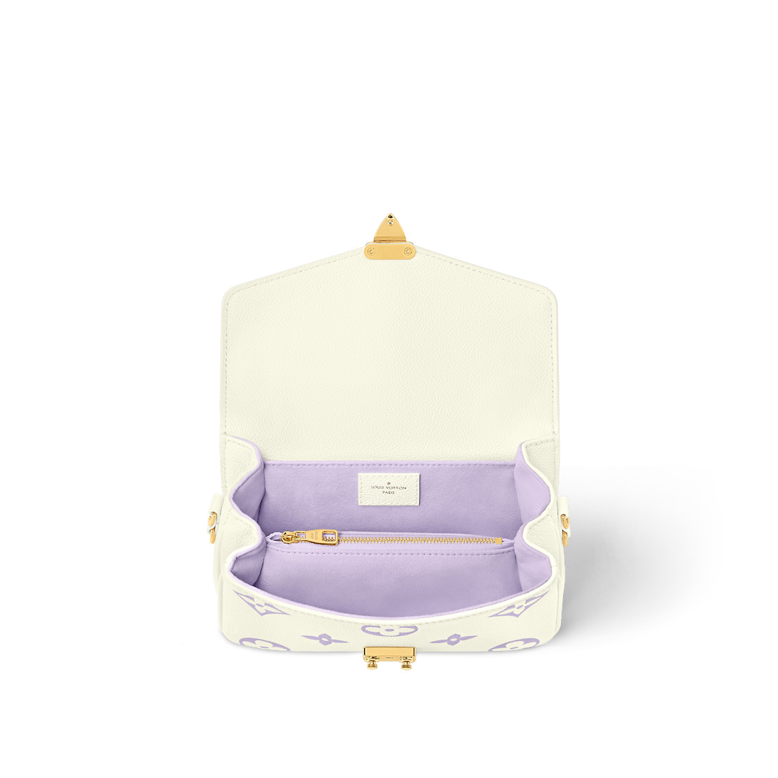 Part of the Milky Way capsule, the two-color Monogram Empreinte leather of this Pochette Métis East West handbag features a luminous off-white base with the Monogram motif embossed and then printed on the leather in a muted pastel tone. The Pochette Métis has a leather handle, a removable chain, and a detachable strap for carry options.