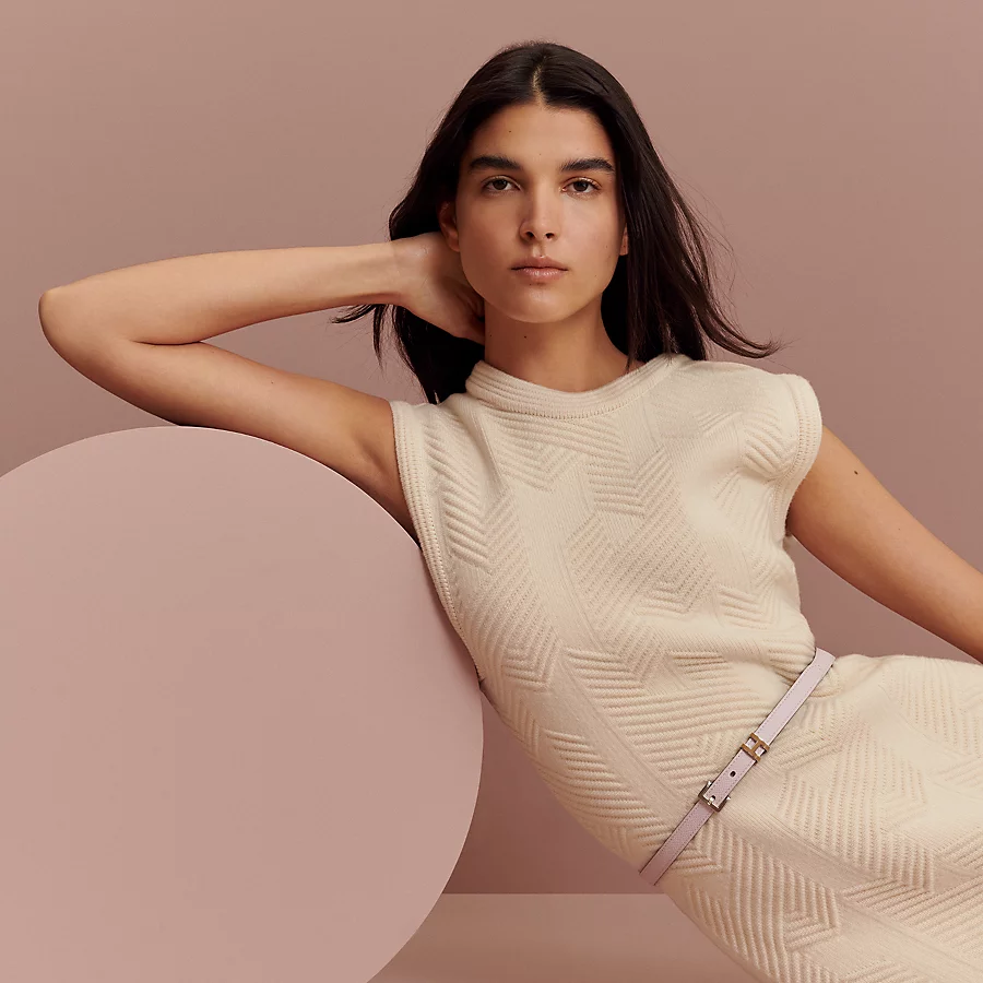 The iconic Pop H becomes a loop passing on a thin and feminine belt, in a new bicolor version with a subtle contrasting detail.