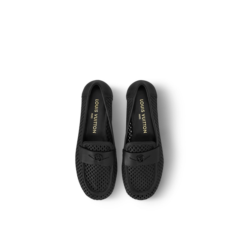 The Soho flat loafer is made of perforated calf leather for a refined look and a comfortable feel. Both elegant and easy to wear, this style is characterized by its rounded toe and cut-out strap, which is signed with a tonal LV Circle accessory. It is finished with a supple leather outsole.